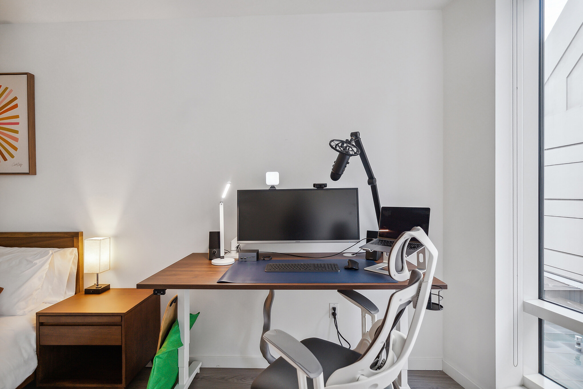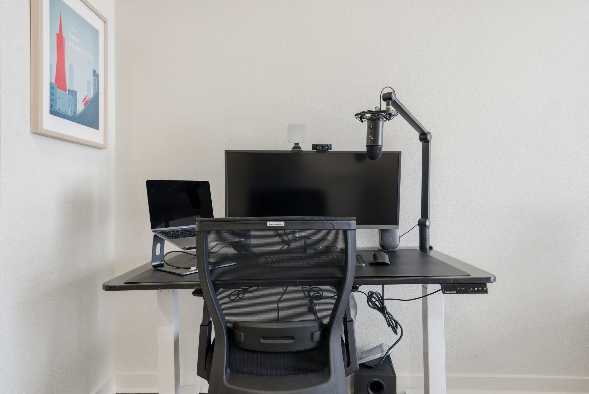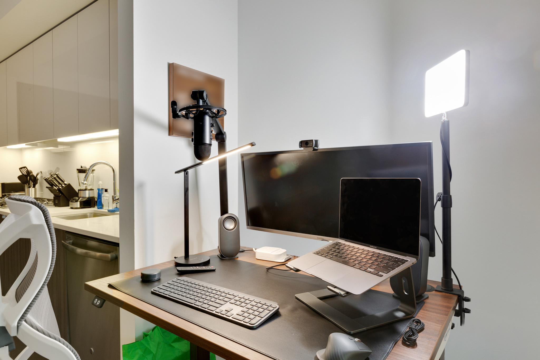 Ultrawide monitor, standing desk, work chair, keyboard, mouse, and private high-speed internet.