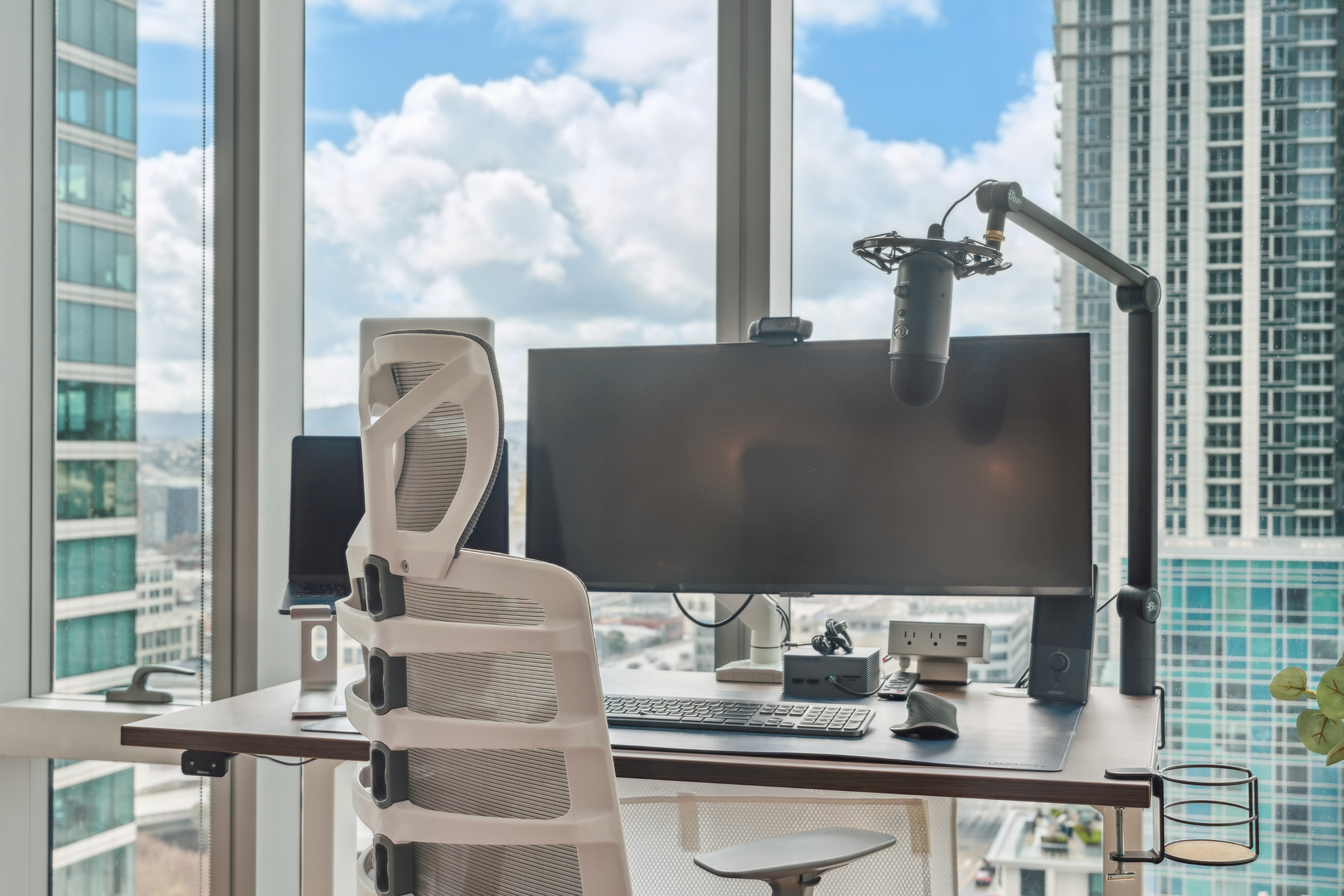 Ultrawide monitor, standing desk, work chair, keyboard, mouse, and private high-speed internet.
